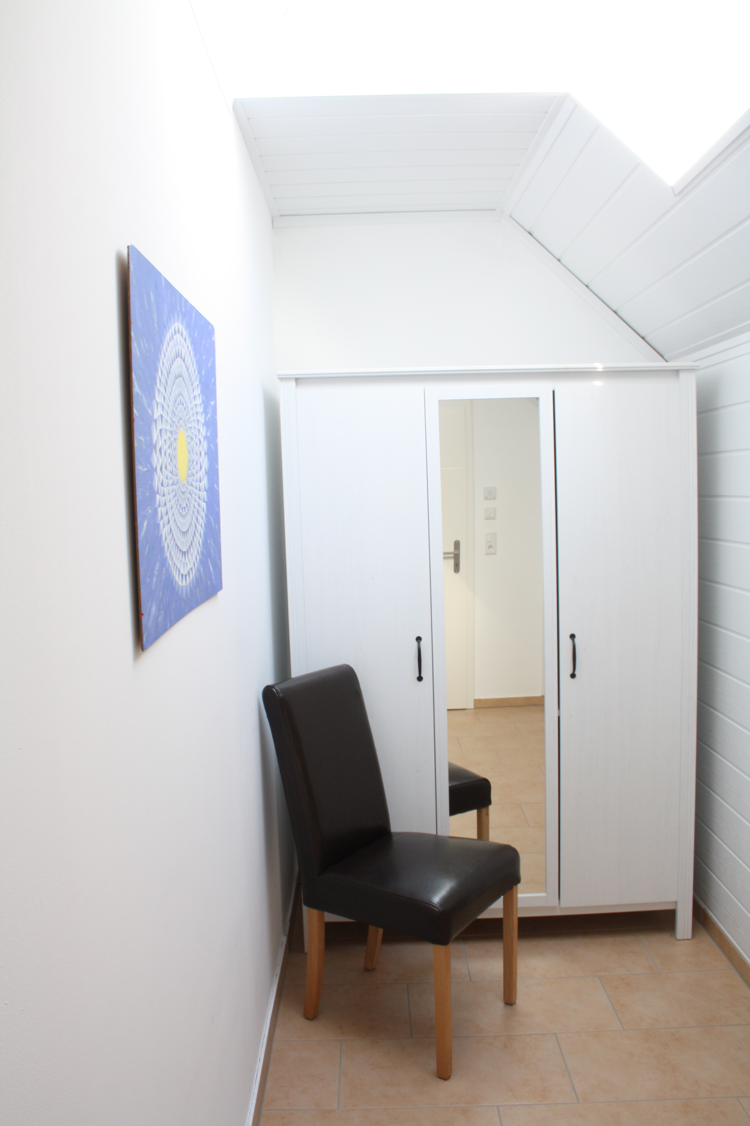 Im Schlafzimmer stehen ein Doppelbett, ein Kleiderschrank und zwei Sessel. Im Bad sind eine ebenerdige Dusche, ein WC und ein Waschtisch mit Schrank zu finden.