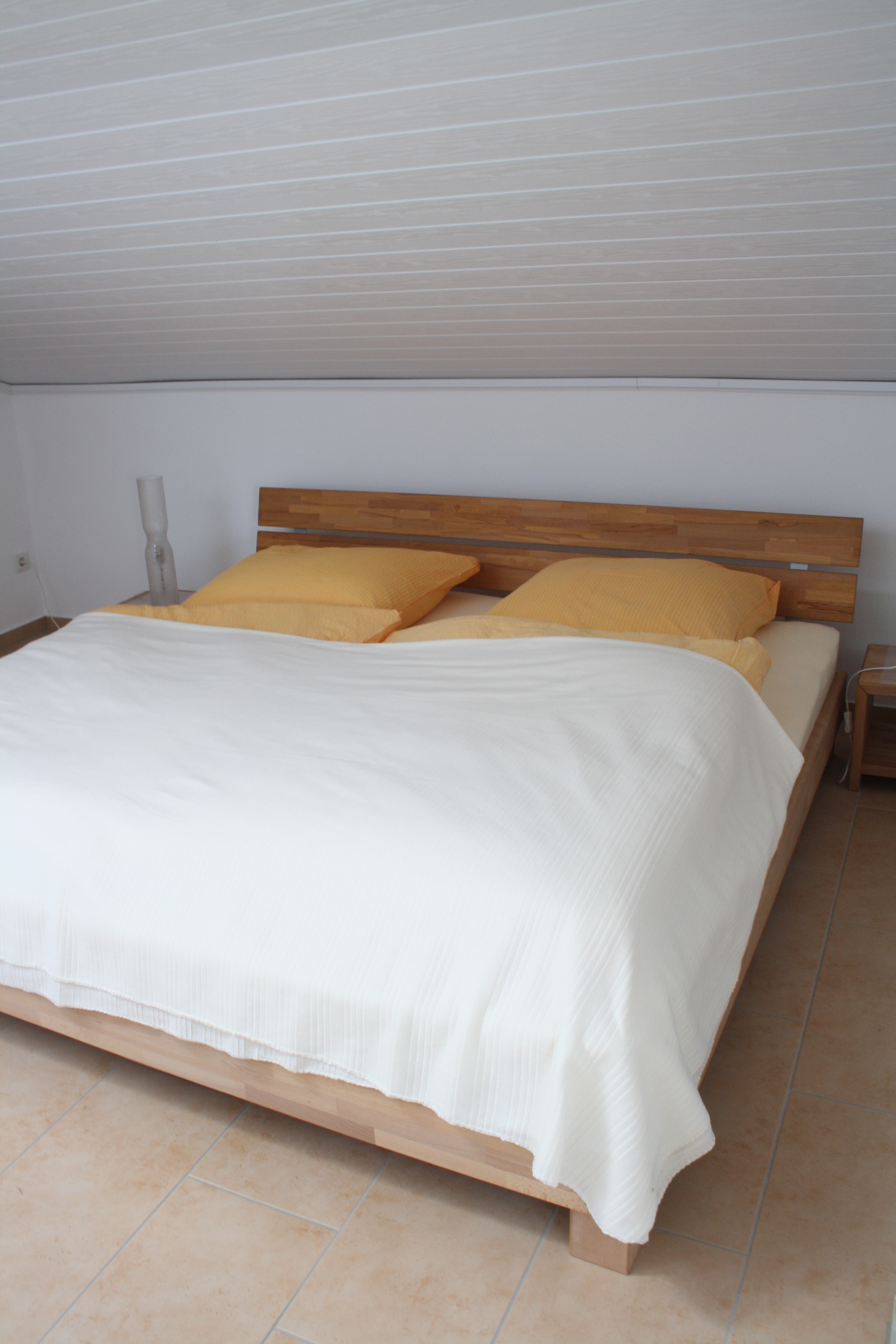 Die Ferienwohnung für 2-4 Personen befindet sich im Dachgeschoss und ist ca. 50 qm groß. Sie hat einen eigenen, separaten Eingang. Die offene Küche ist ausgestattet mit einem Backofen, einer Cerankochplatte, einem Geschirrspüler, einem Kühlschrank mit Tiefkühlfach, einer Kaffeemaschine, einem Toaster und einem Wasserkocher sowie einen Esstisch mit Stühlen. Im Wohnbereich finden Sie eine Couch, zwei Sessel, einen Wohnzimmertisch und den Fernseher. Etwas abgetrennt in einer Dachnische stehen zwei Polsterbetten.